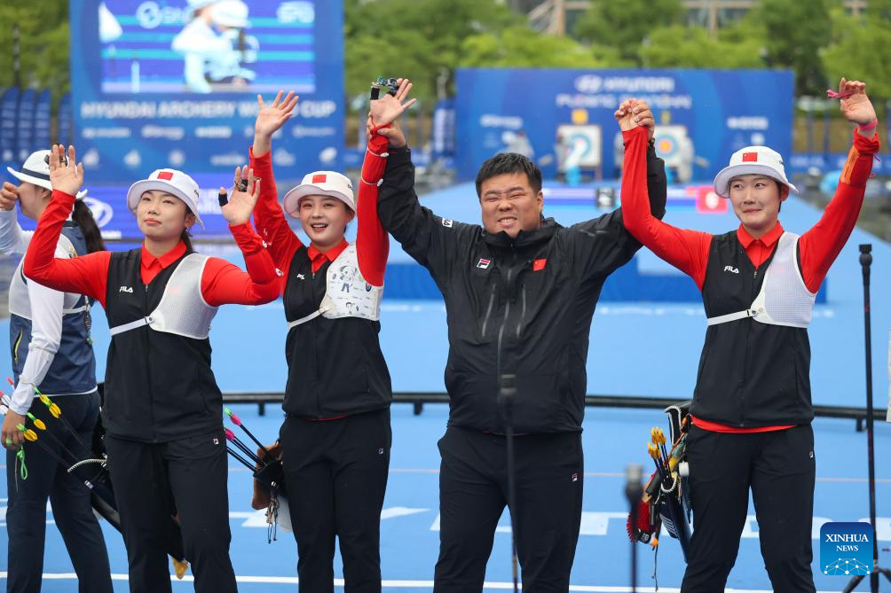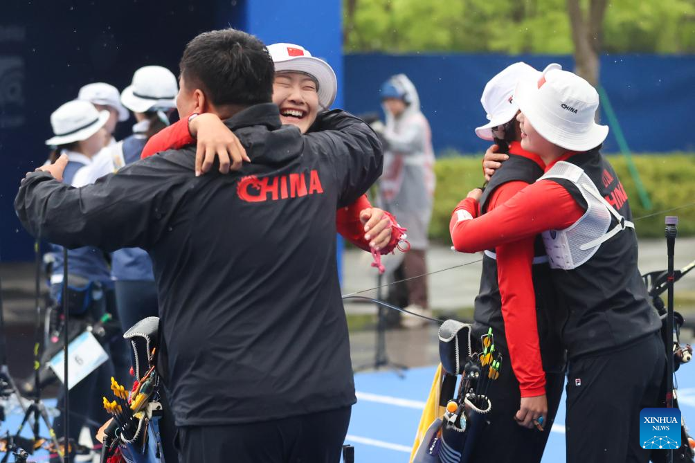 Members of team China celebrate after winning the Women's Recurve Team Final between China and South Korea at Shanghai 2024 Archery World Cup Stage 1 in Shanghai, China, April 28, 2024. (Xinhua/Wang Xiang)