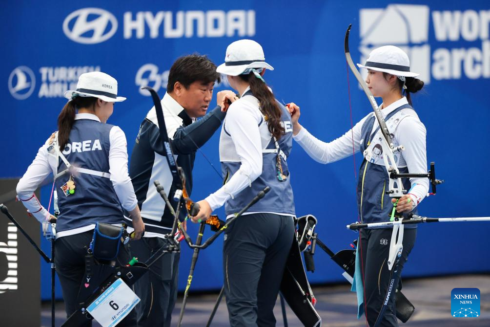 Members of team South Korea encourage each other during the Women's Recurve Team Final between China and South Korea at Shanghai 2024 Archery World Cup Stage 1 in Shanghai, China, April 28, 2024. (Xinhua/Wang Xiang)