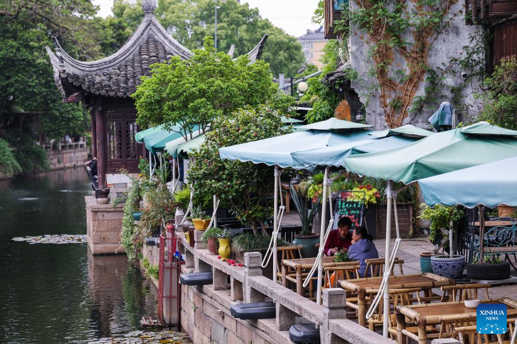 Tourists take a rest and taste tea at Yuehe historical area, Nanhu District, Jiaxing of east China's Zhejiang Province, April 26, 2024. (Xinhua/Xu Yu)