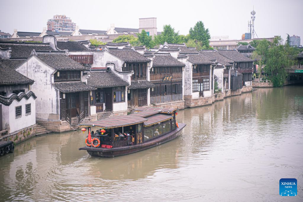 A sightseeing boat sails at Yuehe historical area, Nanhu District, Jiaxing of east China's Zhejiang Province, April 26, 2024. (Xinhua/Jiang Han)