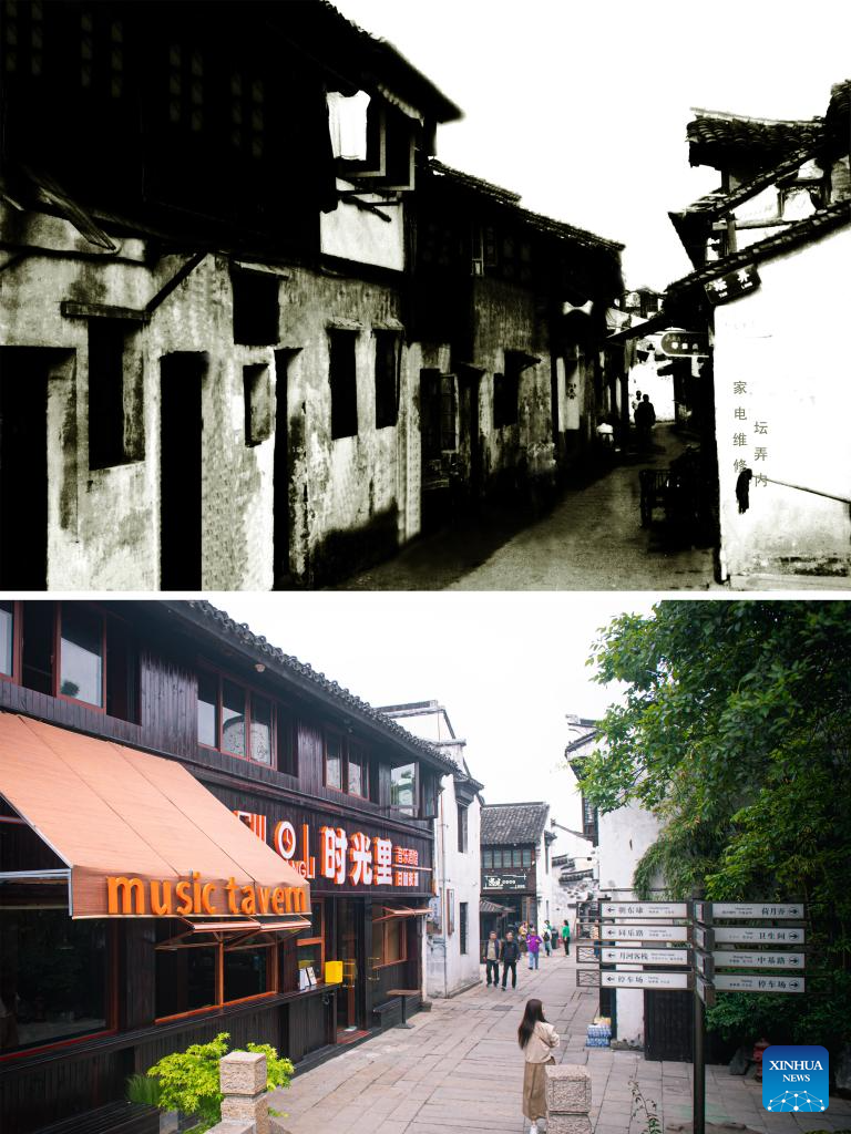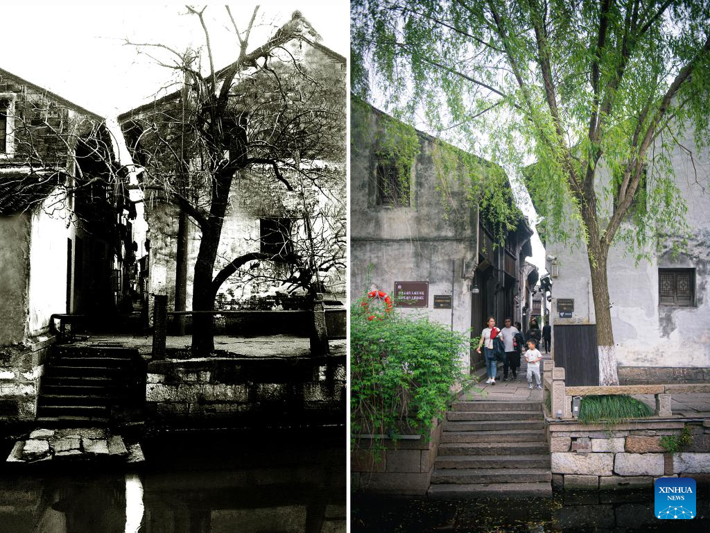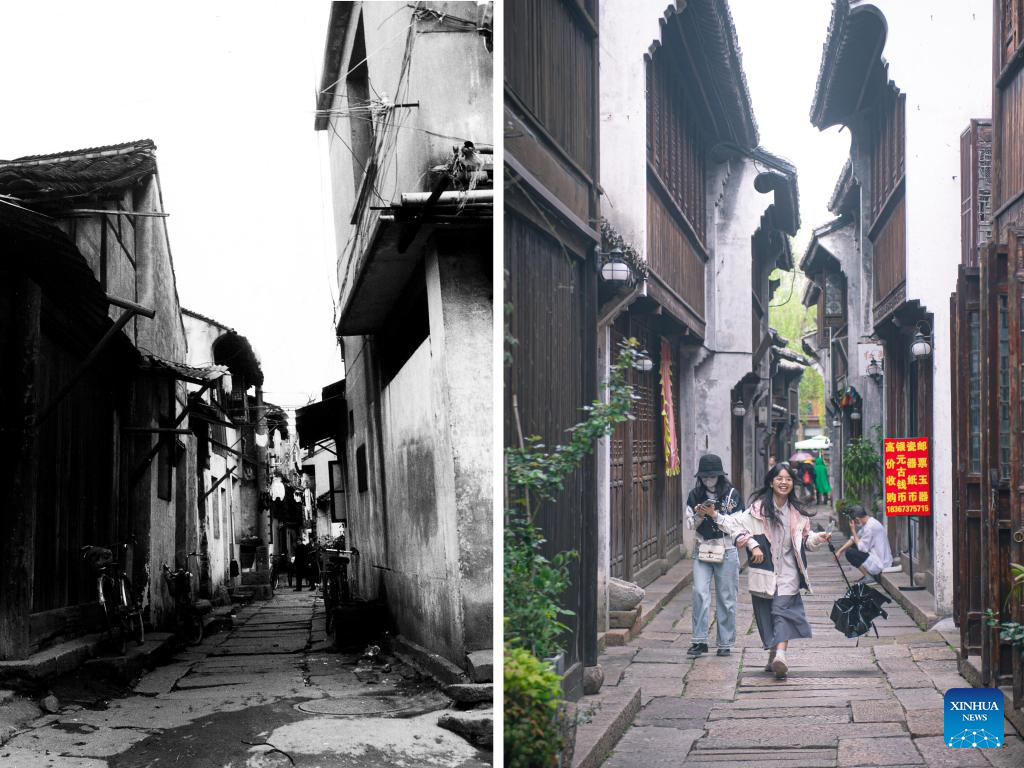 This combo photo shows a view of Yuehe historical area in 1979 (L, photo by Pang Yiying) and people visiting the area on April 26, 2024 (by Xinhua photographer Jiang Han) in Nanhu District, Jiaxing of east China's Zhejiang Province. (Xinhua)