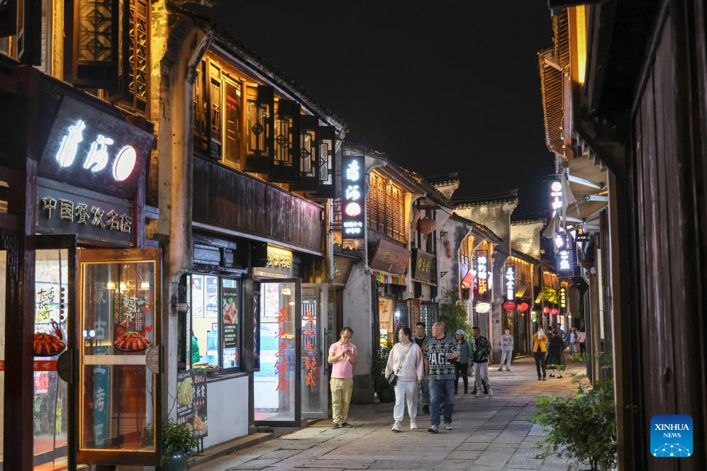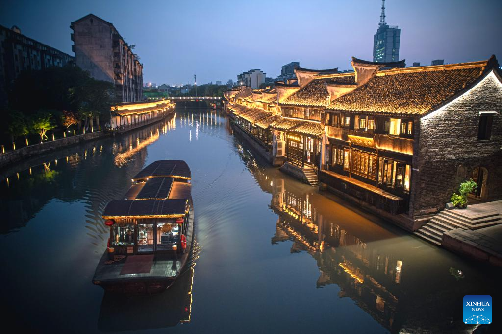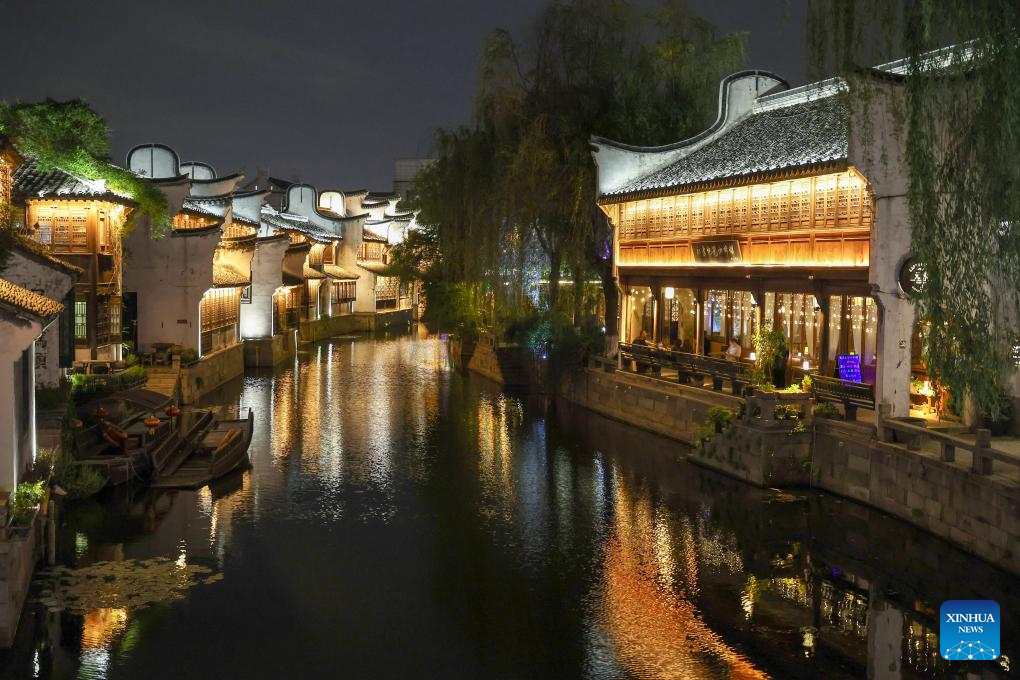 This photo taken on April 25, 2024 shows a night view of Yuehe historical area, Nanhu District, Jiaxing of east China's Zhejiang Province. (Xinhua/Xu Yu)
