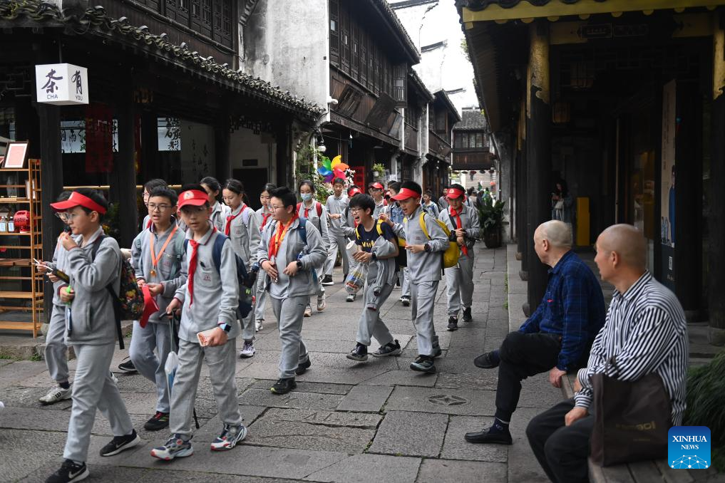 Primary students visit Yuehe historical area, Nanhu District, Jiaxing of east China's Zhejiang Province, April 26, 2024. (Xinhua/Huang Zongzhi)