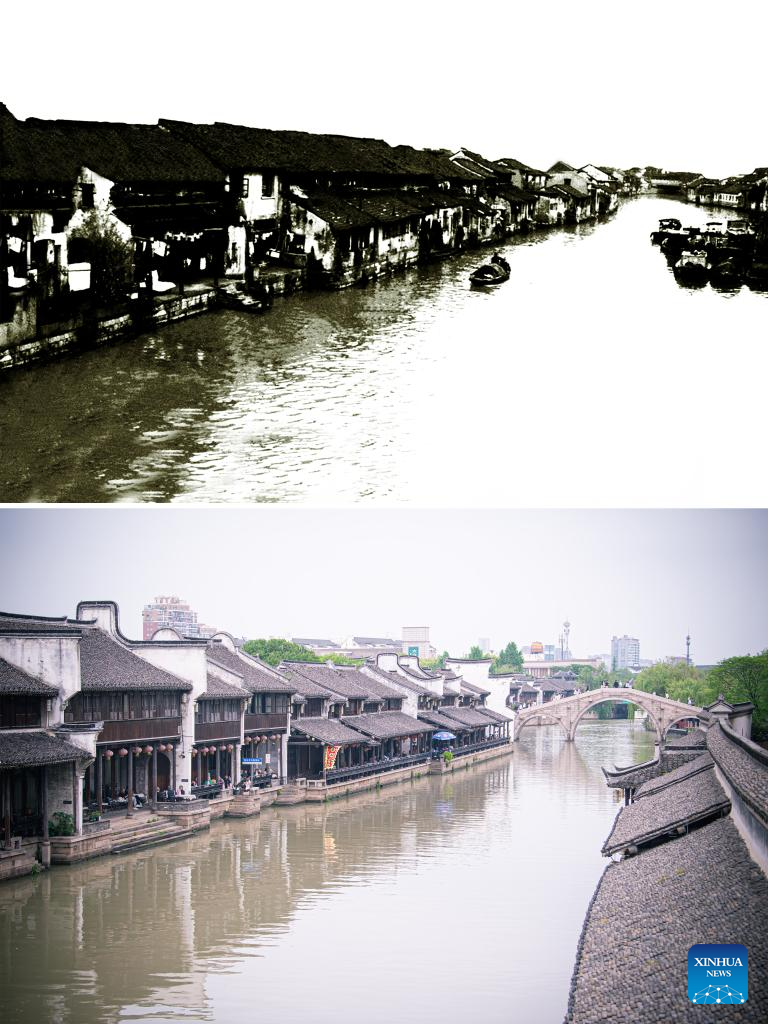 This combo photo shows a view of Yuehe historical area in 1979 (above, photo by Pang Yiying) and the area on April 26, 2024 (by Xinhua photographer Jiang Han) in Nanhu District, Jiaxing of east China's Zhejiang Province. (Xinhua)