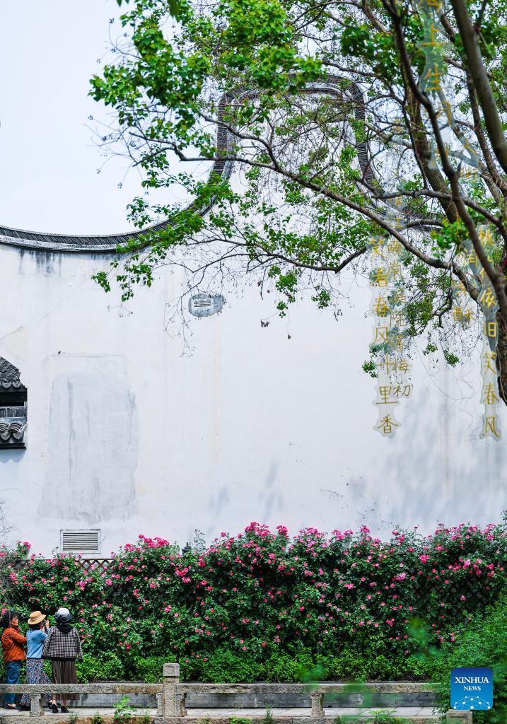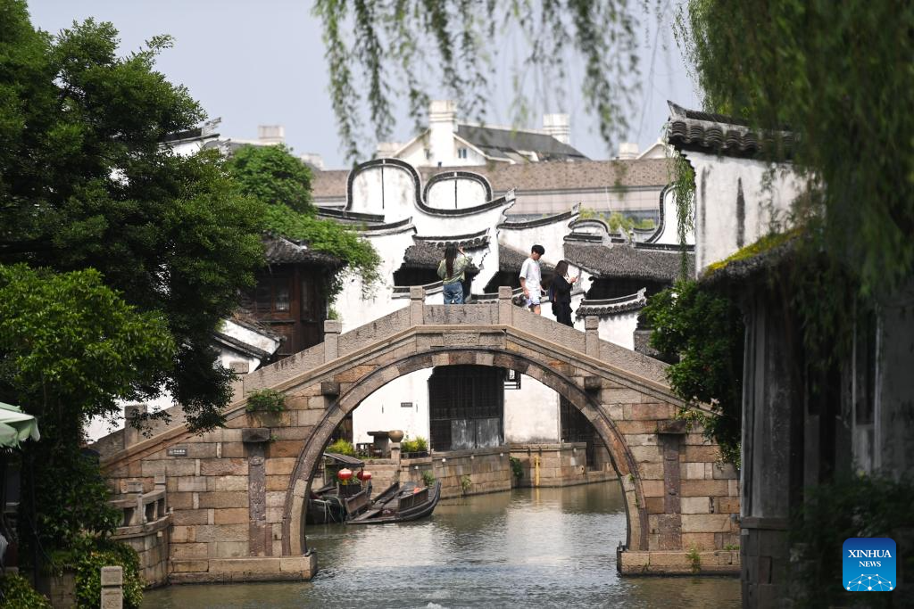 Tourists take photos at Yuehe historical area, Nanhu District, Jiaxing of east China's Zhejiang Province, April 26, 2024. (Xinhua/Xu Yu)