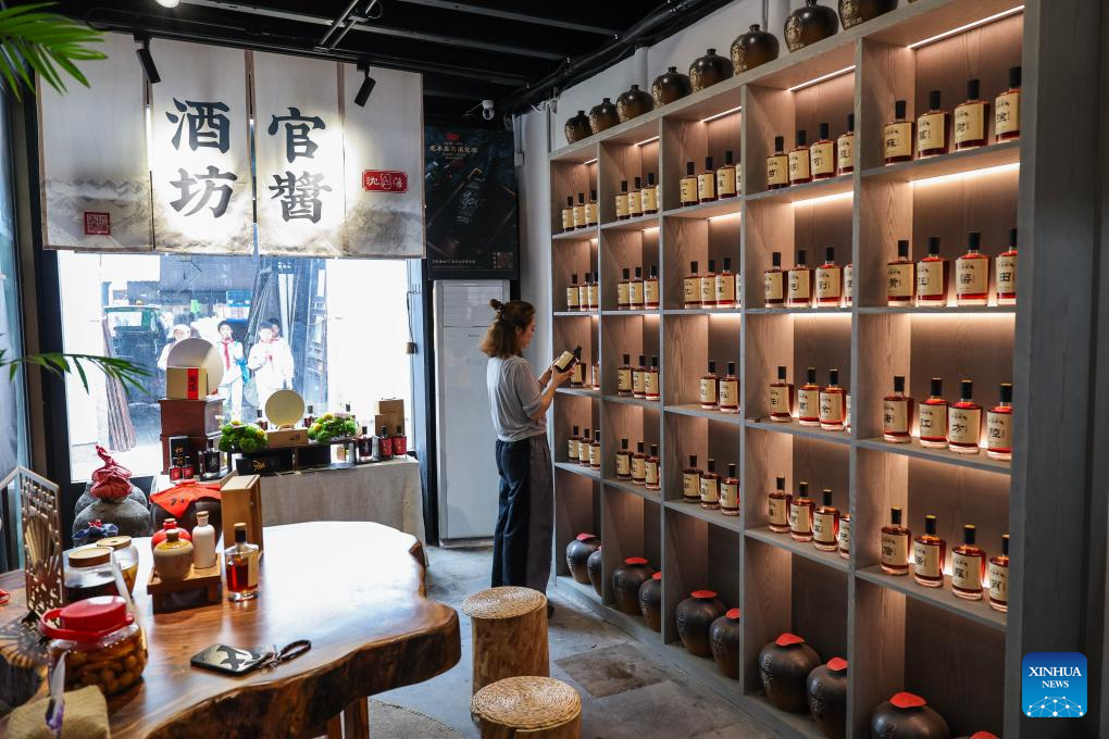 A tourist buys local rice wine at Yuehe historical area, Nanhu District, Jiaxing of east China's Zhejiang Province, April 26, 2024. (Xinhua/Xu Yu)