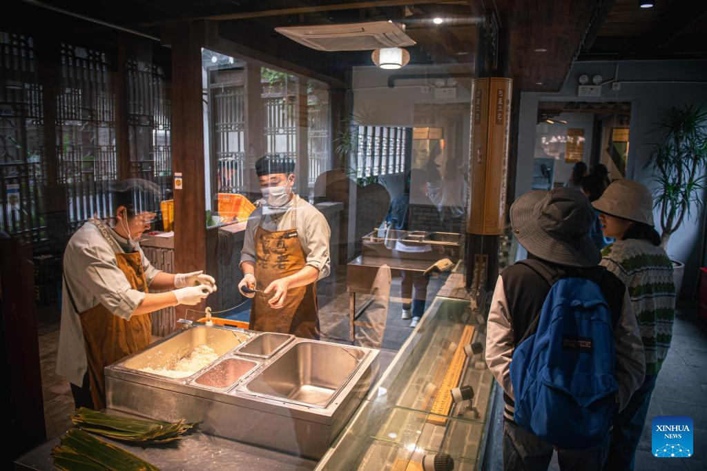 Tourists watch the making of Zongzi, a pyramid-shaped dumpling made of glutinous rice wrapped in bamboo or reed leaves, at Yuehe historical area, Nanhu District, Jiaxing of east China's Zhejiang Province, April 26, 2024. (Xinhua/Jiang Han)