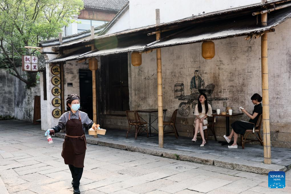 This photo shows a view of the Puyuan Fashion Resort in Jiaxing of east China's Zhejiang Province, April 26, 2024. Paying tribute to the elegant aesthetics of the Song Dynasty (960-1279), the heyday of ancient Chinese art, while combing modern elements, the Puyuan Fashion Resort in Jiaxing of east China's Zhejiang Province offers an immersive cultural travel experience to visitors, ranging from Hanfu fashion shows to themed markets, concerts and sports games. (Xinhua/Mu Yu)