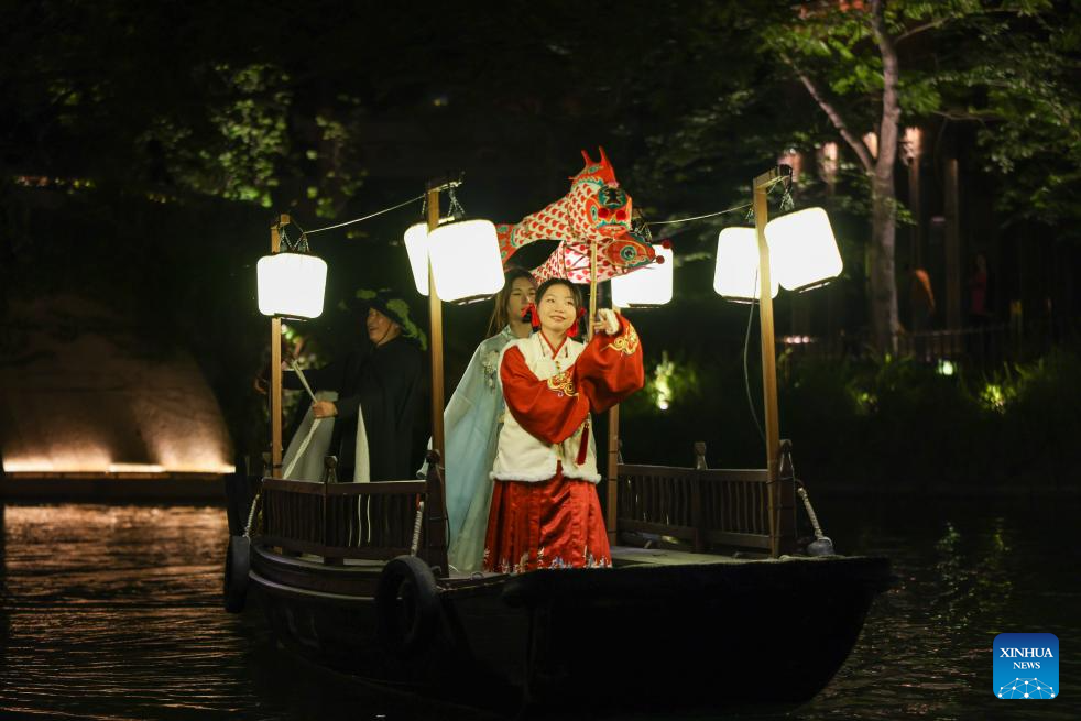 Tourists take a boat at the Puyuan Fashion Resort in Jiaxing of east China's Zhejiang Province, April 26, 2024. Paying tribute to the elegant aesthetics of the Song Dynasty (960-1279), the heyday of ancient Chinese art, while combing modern elements, the Puyuan Fashion Resort in Jiaxing of east China's Zhejiang Province offers an immersive cultural travel experience to visitors, ranging from Hanfu fashion shows to themed markets, concerts and sports games. (Xinhua/Lan Hongguang)
