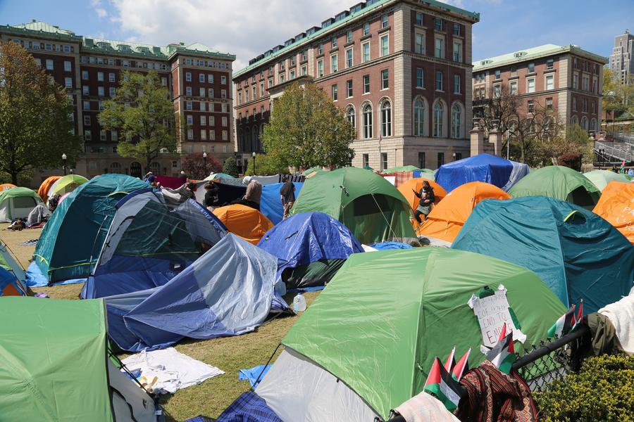 This photo shows tents of the "Gaza Solidarity Encampment" at Columbia University in New York City, the United States, April 26, 2024. (Xinhua/Liu Yanan)