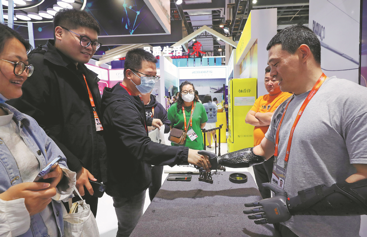A visitor shakes hands with a staff member equipped with bionic hands enabled by brain-computer interface during an expo in Shanghai. FANG ZHE/XINHUA