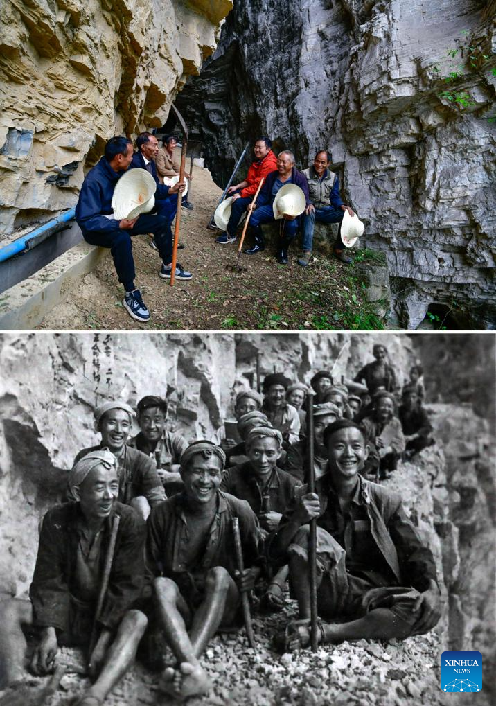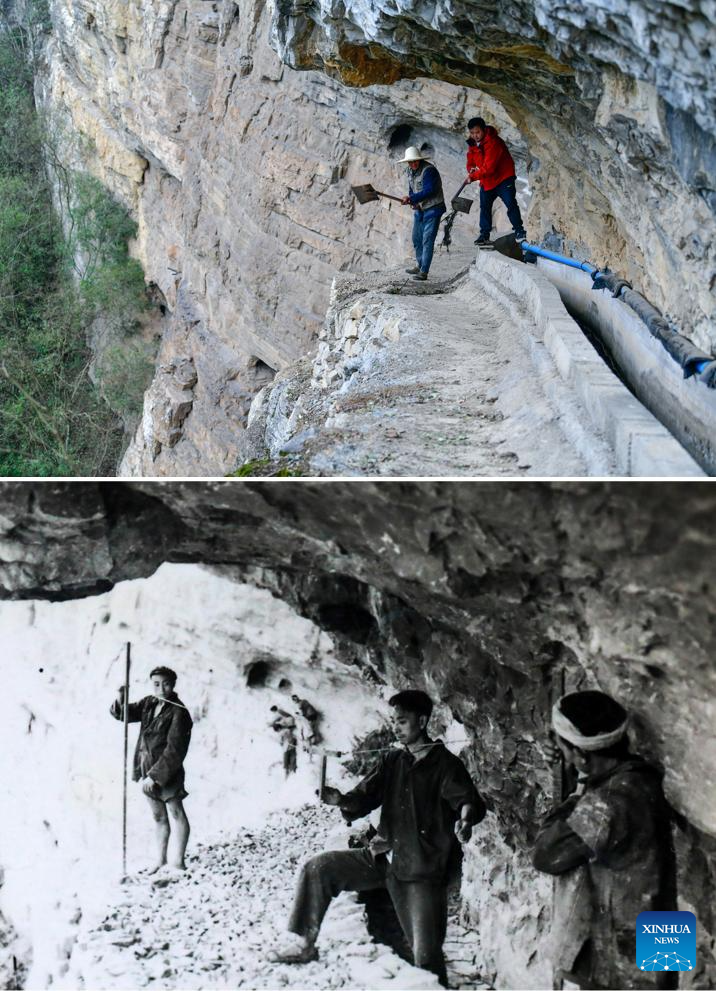 This combo photo shows members of a canal maintenance team cleaning up a canal on the cliffs on April 24, 2024 (above, photo by Xinhua photographer Yang Wenbin), and members of a canal construction team building a canal on the cliffs in 1960 (below, photo by Wang Zhenxiang), in Shengji Township of Bijie City, southwest China's Guizhou Province.
