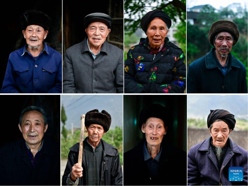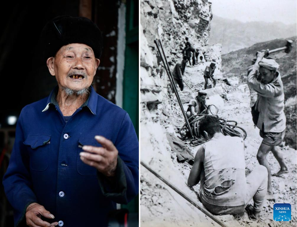 This combo photo shows Liu Xinzhi, a builder of a canal on the cliffs, talking about the construction of a canal in the past on April 24, 2024 (L, photo by Xinhua photographer Yang Wenbin), and Liu Xinzhi (1st R) building a canal on the cliffs with other villagers in 1960 (R, photo by Wang Zhenxiang), in Shengji Township of Bijie City, southwest China's Guizhou Province. (Xinhua)