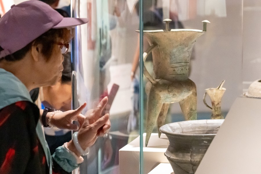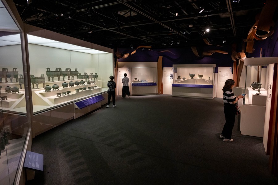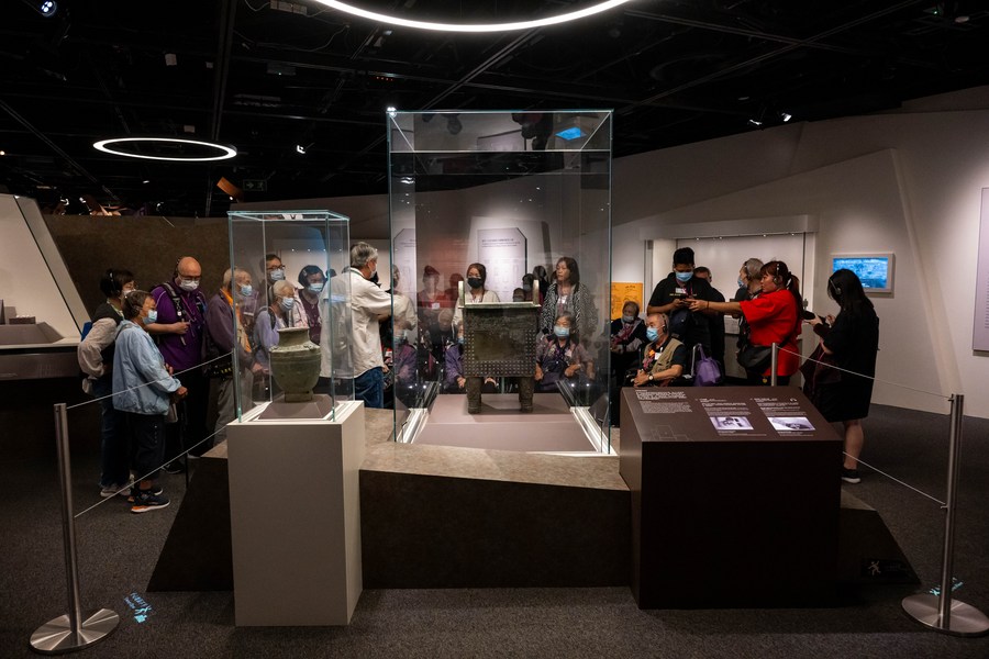 Audiences visit the "Center of the World" exhibition, which aims to trace back to the origin of Chinese civilization, focusing on Xia, Shang and Zhou, the three earliest dynasties in Chinese history and collectively referred to as the Bronze Age, held in the Hong Kong Museum of History in south China's Hong Kong, April 24, 2024. (Xinhua/Zhu Wei)