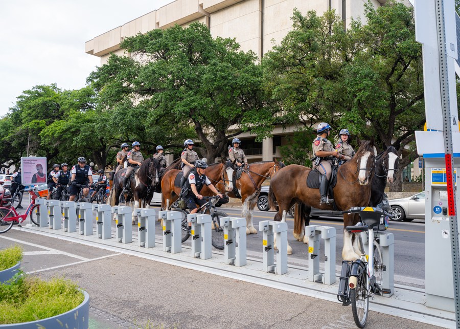 Texas state troopers are pictured after a Palestinian protest on the campus of The University of Texas at Austin in Texas, the United States, April 24, 2024. (Photo by Christopher Davila/Xinhua)