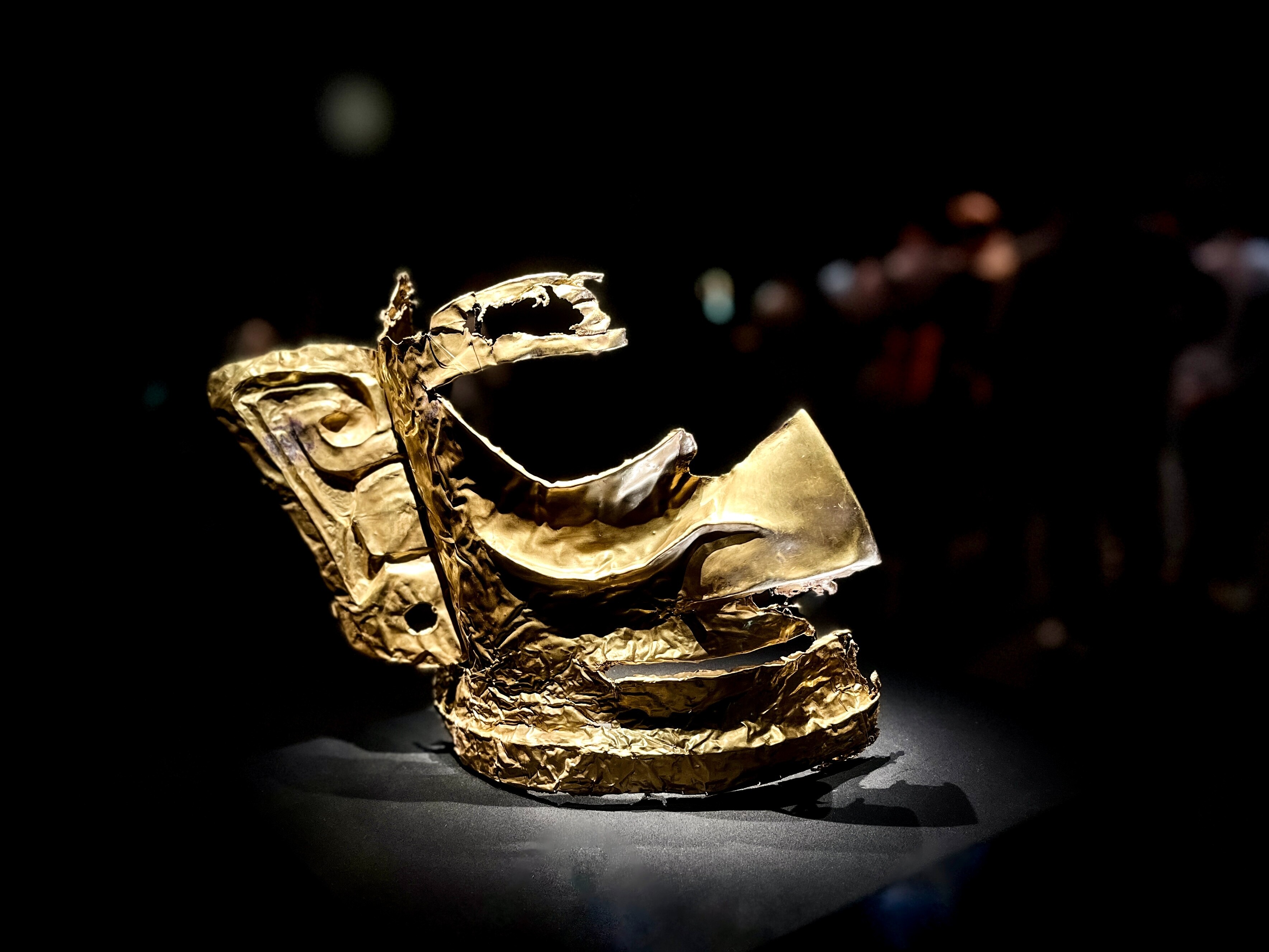 Photo shows the Gold mask on display at the Sanxingdui Museum.? (People's Daily Online/Xian Jiangnan)