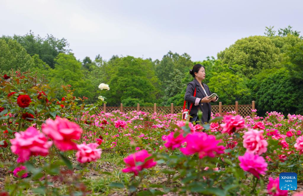 A tourist visits the botanical garden in Jiaxing City, east China's Zhejiang Province, April 27, 2024. Recently, Jiaxing Botanical Garden completed a new round of renovation and attracted many tourists. (Xinhua/Sun Fanyue)