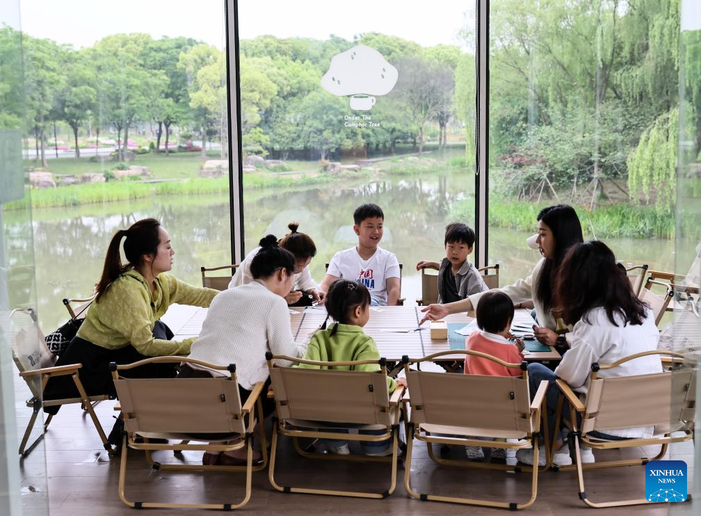 Citizens play games in a lounge at the botanical garden in Jiaxing City, east China's Zhejiang Province, April 27, 2024. Recently, Jiaxing Botanical Garden completed a new round of renovation and attracted many tourists. (Xinhua/Lan Hongguang)