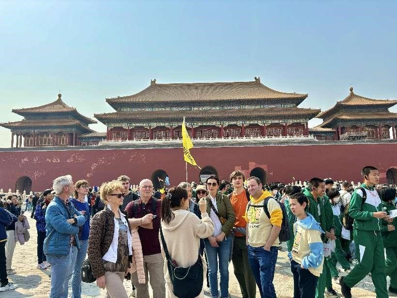 Recently, a Belgian travel agency organized a tour group to China, taking advantage of a 15-day visa-free policy issued by China. The group visited Beijing, Guizhou, and Guangxi. Photo shows Belgian tourists visiting the Palace Museum, also known as the Forbidden City in Beijing. (Photo/Vincent Oomen)