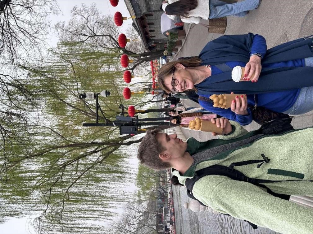 Belgian tourists taste snacks in Houhai, a scenic spot in Beijing, in early April. (Photo/Vincent Oomen)