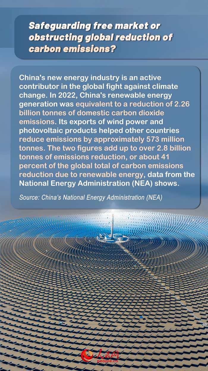 China's new energy industry is an active contributor in the global fight against climate change. In 2022, China's renewable energy generation was equivalent to a reduction of 2.26 billion tonnes of domestic carbon dioxide emissions. Its exports of wind power and photovoltaic products helped other countries reduce emissions by approximately 573 million tonnes. The two figures add up to over 2.8 billion tonnes of emissions reduction, or about 41 percent of the global total of carbon emissions reduction due to renewable energy, data from the National Energy Administration (NEA) shows.