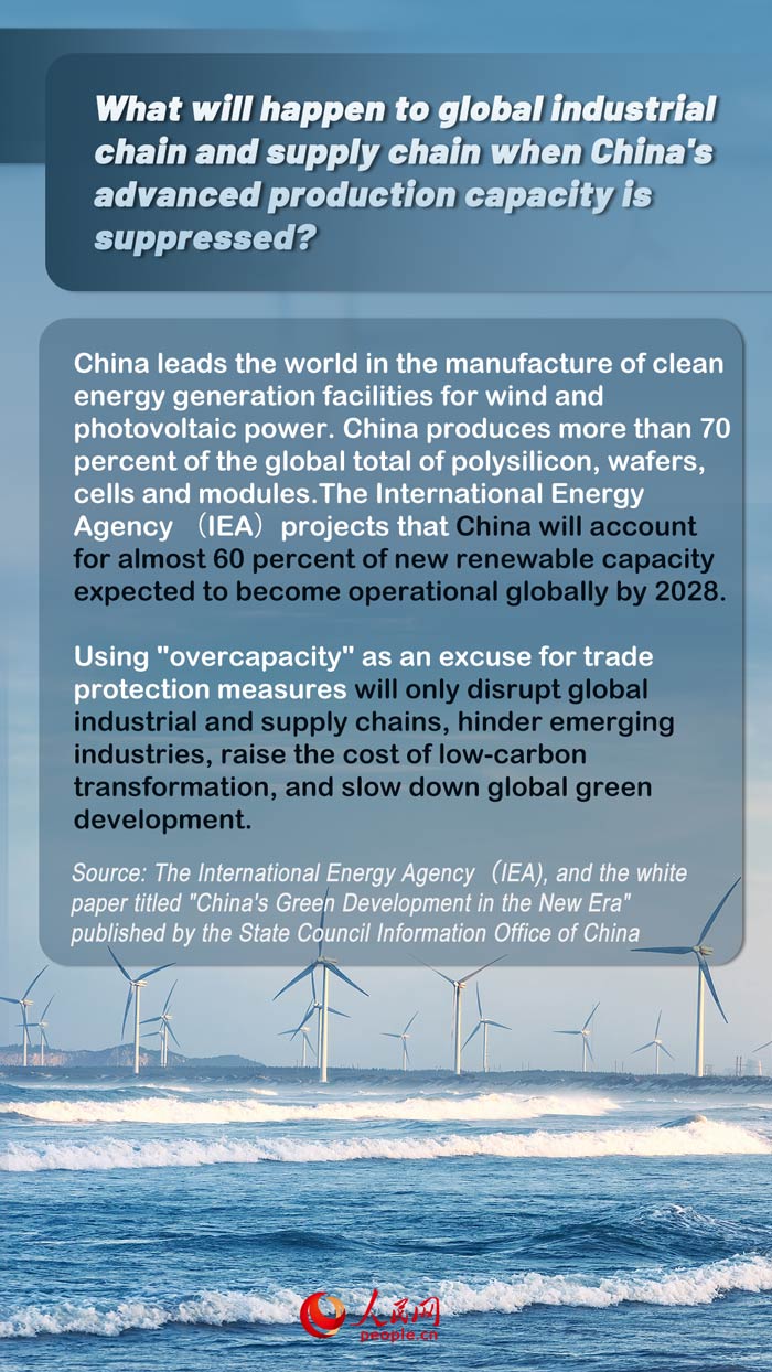 China leads the world in the manufacture of clean energy generation facilities for wind and photovoltaic power. China produces more than 70 percent of the global total of polysilicon, wafers, cells and modules.The International Energy Agency (IEA)projects that China will account for almost 60 percent of new renewable capacity expected to become operational globally by 2028. Using "overcapacity" as an excuse for trade protection measures will only disrupt global industrial and supply chains, hinder emerging industries, raise the cost of low-carbon transformation, and slow down global green development.