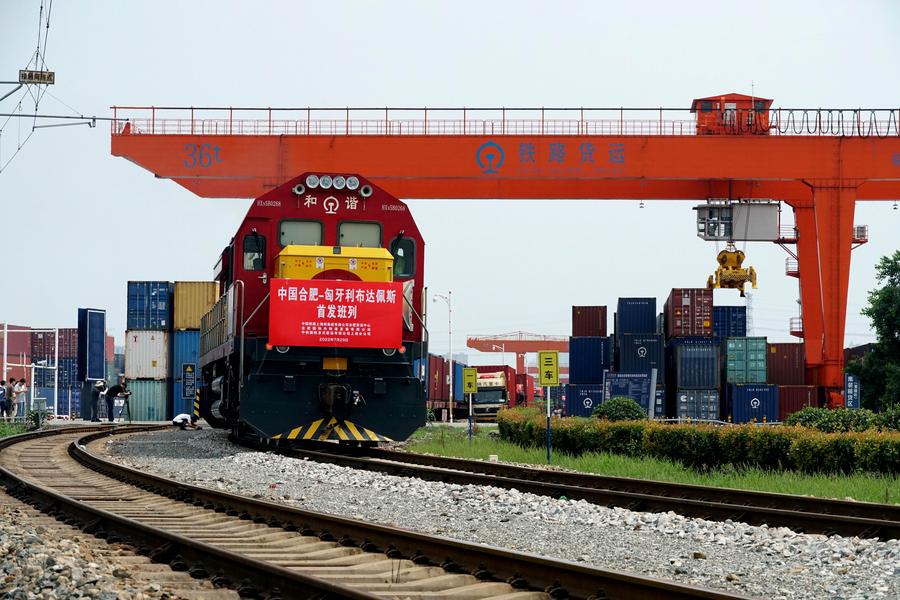 A China-Europe freight train bound for Budapest, Hungary leaves a logistics base in Hefei, east China's Anhui Province, July 29, 2022. (Photo by Xi Jingyu/Xinhua)