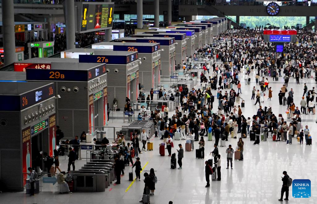 Passengers are seen at the waiting hall of Zhengzhou East Railway Station in Zhouzheng, central China's Henan Province, on April 30, 2024. China's railway network is expected to handle 144 million passenger trips during the eight-day May Day holiday travel rush, the China State Railway Group Co., Ltd. said Monday. (Xinhua/Hao Yuan)