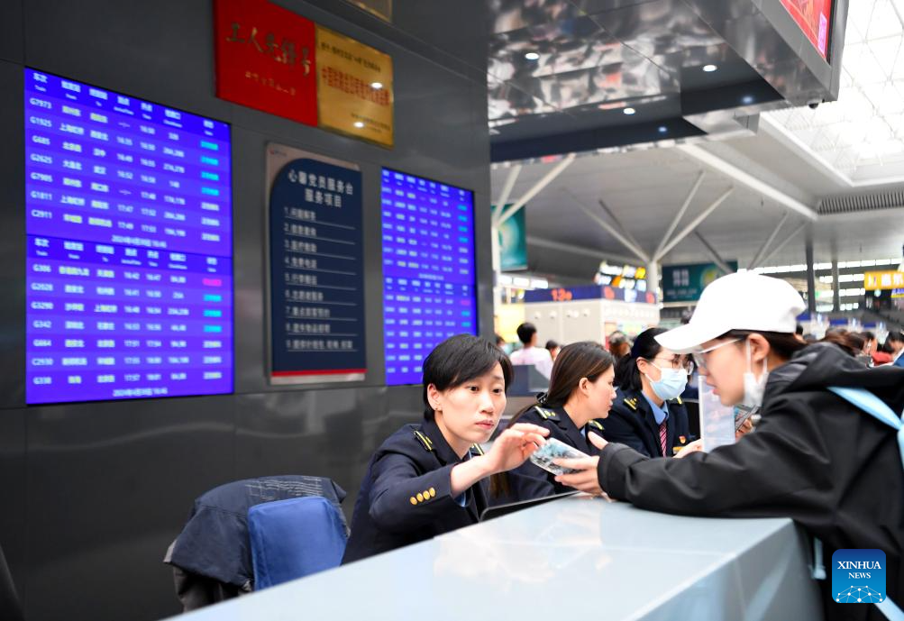 Passengers inquire information at the service desk of Jinhua Railway Station in Jinhua, east China's Zhejiang Province, on April 30, 2024. China's railway network is expected to handle 144 million passenger trips during the eight-day May Day holiday travel rush, the China State Railway Group Co., Ltd. said Monday. (Photo by Hu Xiaofei/Xinhua)