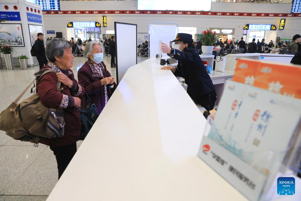 Passengers inquire information at the service desk of Xuzhou East Railway Station in Xuzhou, east China's Jiangsu Province, on April 30, 2024. China's railway network is expected to handle 144 million passenger trips during the eight-day May Day holiday travel rush, the China State Railway Group Co., Ltd. said Monday. (Xinhua/Mao Jun)