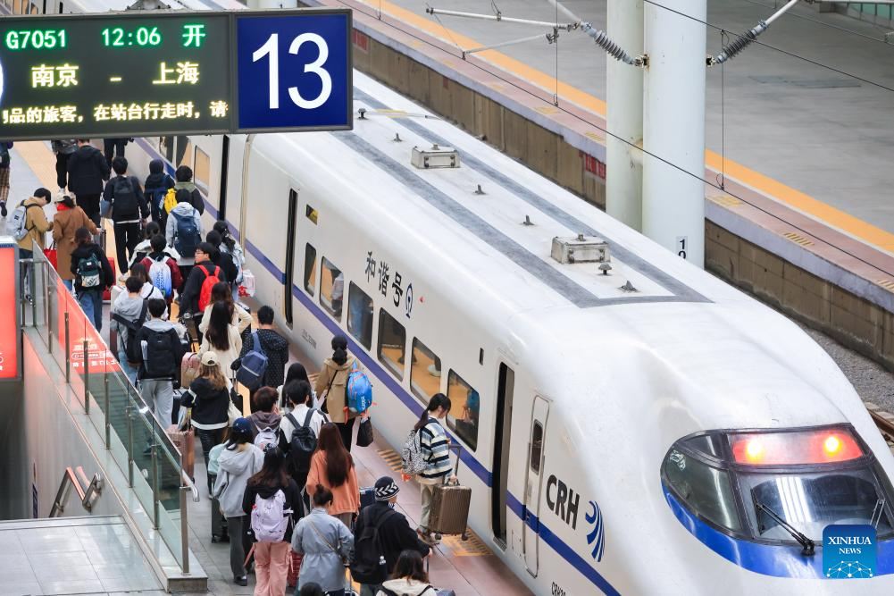 Passengers board a train at Nanjing Railway Station in Nanjing, capital of east China's Jiangsu Province, on April 30, 2024. China's railway network is expected to handle 144 million passenger trips during the eight-day May Day holiday travel rush, the China State Railway Group Co., Ltd. said Monday. (Photo by Su Yang/Xinhua)