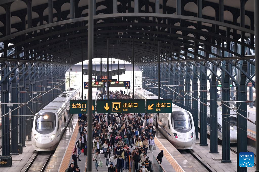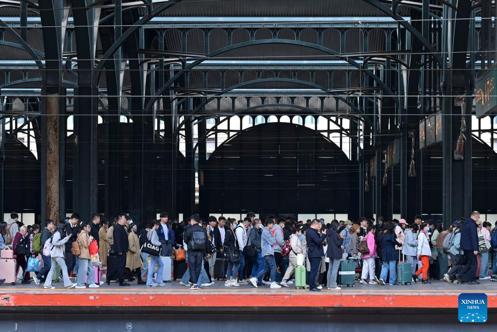 Passengers are seen at the platform of Harbin Railway Station in Harbin, capital of northeast China's Heilongjiang Province, on April 30, 2024. China's railway network is expected to handle 144 million passenger trips during the eight-day May Day holiday travel rush, the China State Railway Group Co., Ltd. said Monday. (Photo by Yuan Yong/Xinhua)