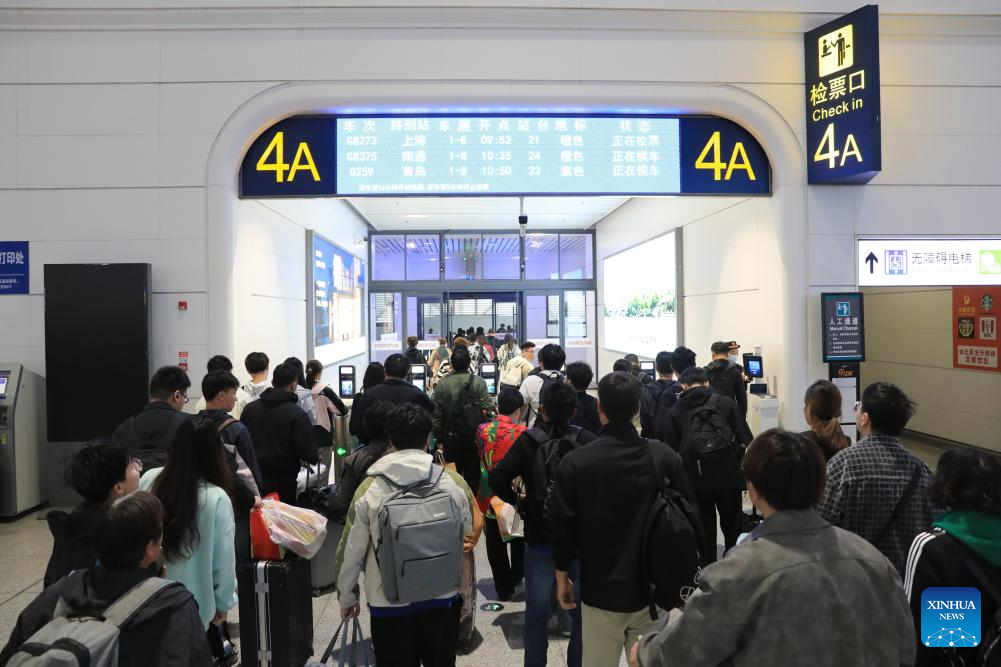 Passengers queue to check their tickets at Xuzhou East Railway Station in Xuzhou, east China's Jiangsu Province, on April 30, 2024. China's railway network is expected to handle 144 million passenger trips during the eight-day May Day holiday travel rush, the China State Railway Group Co., Ltd. said Monday. (Xinhua/Mao Jun)