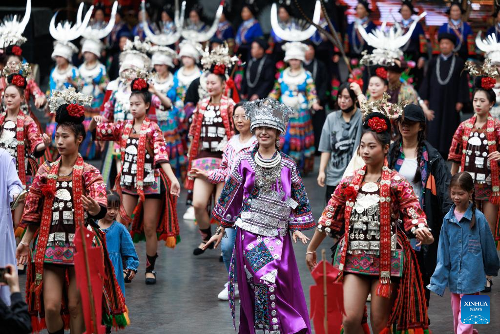 Tourists donning traditional ethnic attire visit Xijiang Qianhu Miao Village in Leishan County of Qiandongnan Miao and Dong Autonomous Prefecture, southwest China's Guizhou Province, on April 30, 2024. As the May Day holiday is approaching, the village held many activities such as basketball match, costume show and song and dance performances to welcome tourists. (Xinhua/Liu Xu)