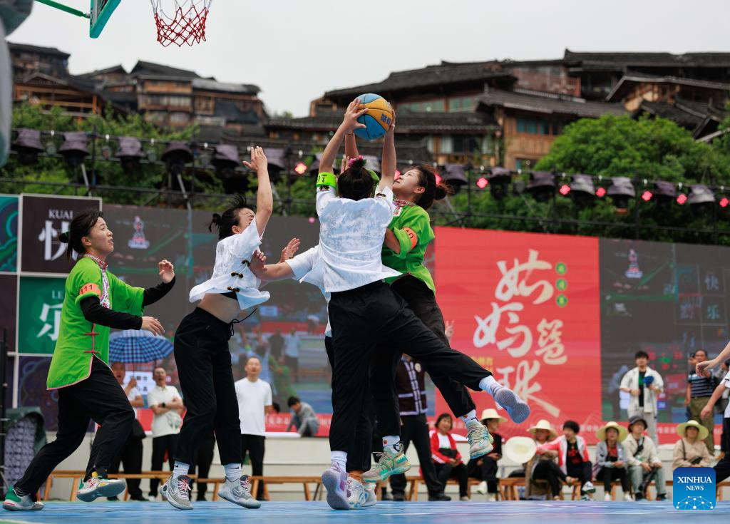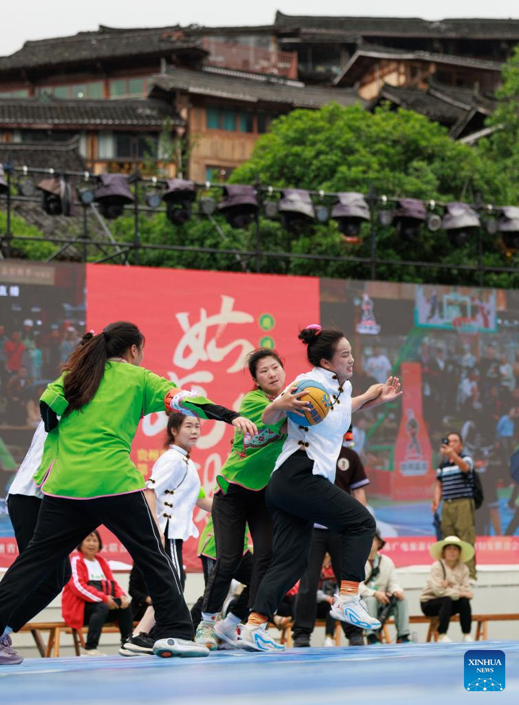 Players compete during a women's basketball invitational match at Xijiang Qianhu Miao Village in Leishan County of Qiandongnan Miao and Dong Autonomous Prefecture, southwest China's Guizhou Province, on April 30, 2024. As the May Day holiday is approaching, the village held many activities such as basketball match, costume show and song and dance performances to welcome tourists. (Xinhua/Liu Xu)