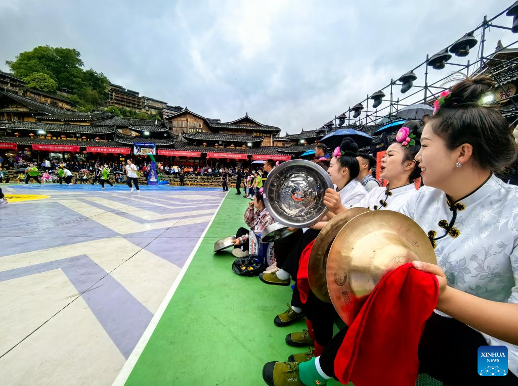 Players attend a women's basketball invitational match at Xijiang Qianhu Miao Village in Leishan County of Qiandongnan Miao and Dong Autonomous Prefecture, southwest China's Guizhou Province, on April 30, 2024. As the May Day holiday is approaching, the village held many activities such as basketball match, costume show and song and dance performances to welcome tourists. (Xinhua/Liu Xu)