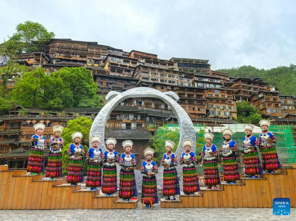 Staff members of the scenic spot greet tourists at Xijiang Qianhu Miao Village in Leishan County of Qiandongnan Miao and Dong Autonomous Prefecture, southwest China's Guizhou Province, on April 30, 2024. As the May Day holiday is approaching, the village held many activities such as basketball match, costume show and song and dance performances to welcome tourists. (Xinhua/Liu Xu)