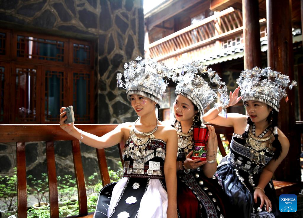 A tourist takes selfies at Xijiang Qianhu Miao Village in Leishan County of Qiandongnan Miao and Dong Autonomous Prefecture, southwest China's Guizhou Province, on April 30, 2024. As the May Day holiday is approaching, the village held many activities such as basketball match, costume show and song and dance performances to welcome tourists. (Xinhua/Liu Xu)