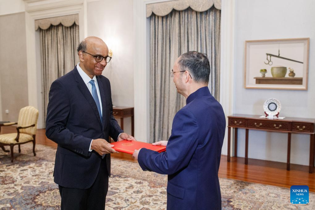 China's new ambassador to singapore Cao Zhongming presents his Letter of Credence to Tharman Shanmugaratnam, president of Singapore, in Singapore, April 30, 2024. (Ministry of Communications and Information of Singapore/Handout via Xinhua)