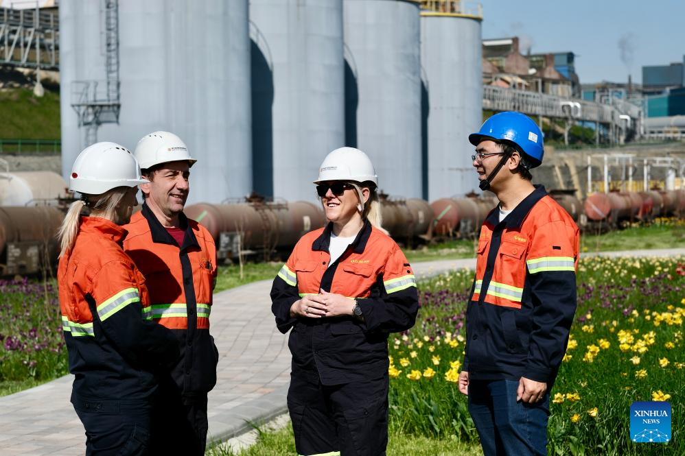 Staff chat at the smeltery of Serbia Zijin Copper DOO in Bor of Serbia, April 11, 2024. The city of Bor in Serbia is rich in copper resources. Zijin Mining Group built new and advanced production facilities in the Serbian company and set new standards for environment-friendly mining. (Xinhua/Zheng Kaijun)