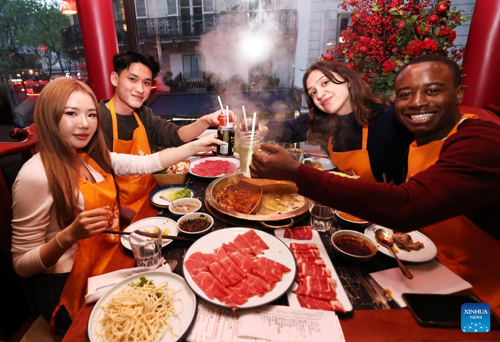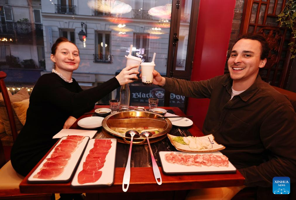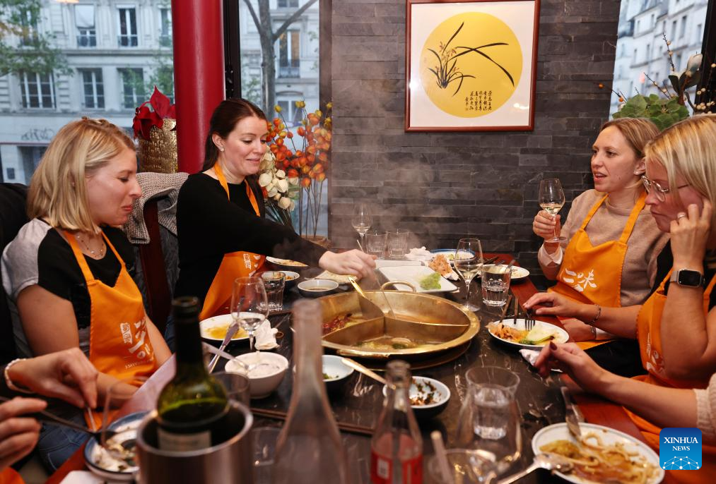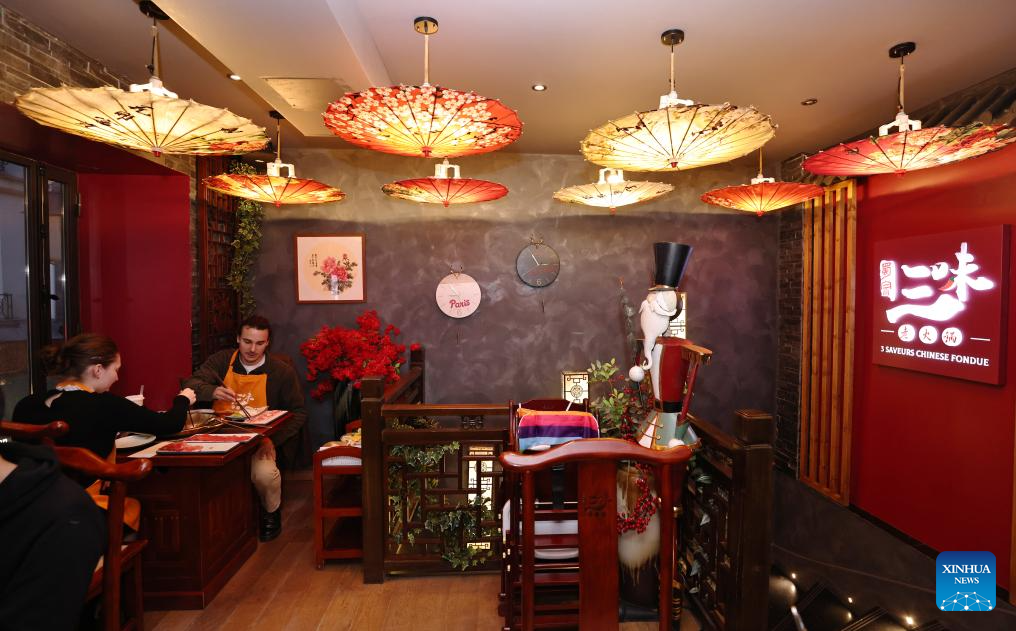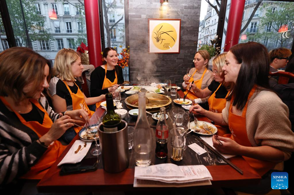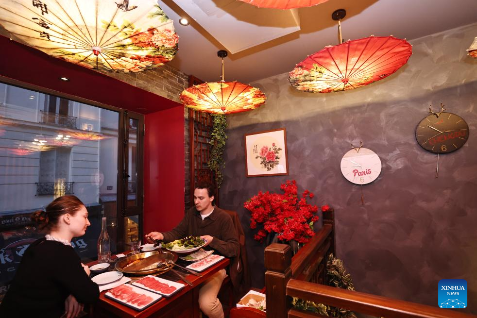Customers dine at a hotpot restaurant in Paris, French, on April 21, 2024. In recent years, the city of Paris has witnessed a growing popularity of the Chinese hotpot. (Xinhua/Gao Jing)