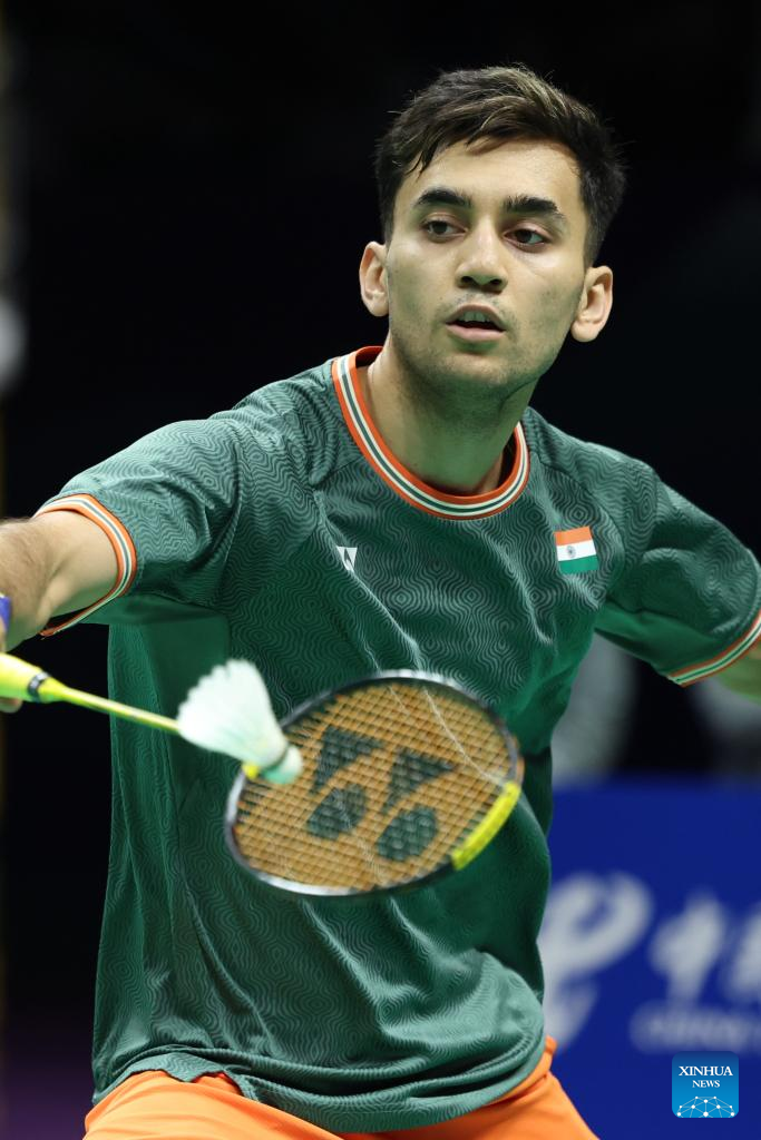Lakshya Sen of India competes in the singles match against Li Shifeng of China of the quarterfinal between China and India at BWF Thomas Cup Finals in Chengdu, southwest China's Sichuan Province, May 2, 2024. (Xinhua/Jiang Hongjing)