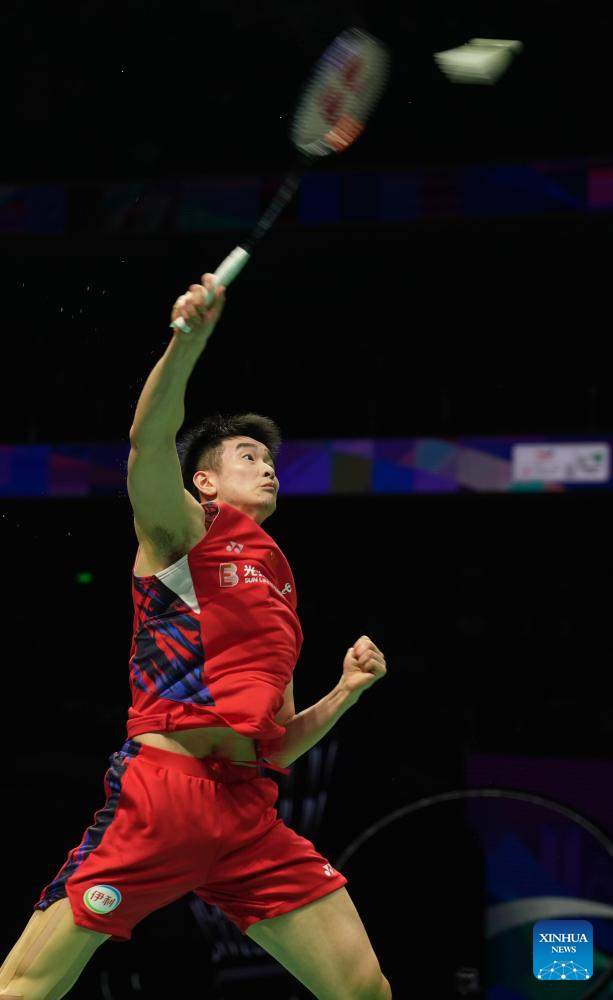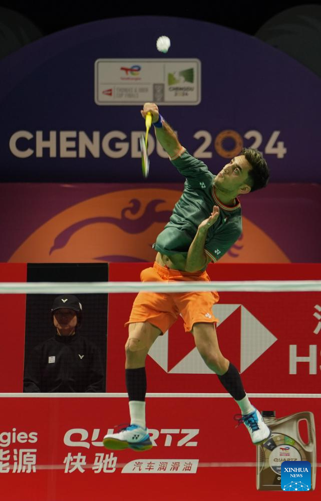 Lakshya Sen of India competes in the singles match against Li Shifeng of China of the quarterfinal between China and India at BWF Thomas Cup Finals in Chengdu, southwest China's Sichuan Province, May 2, 2024. (Xinhua/Chen Bin)