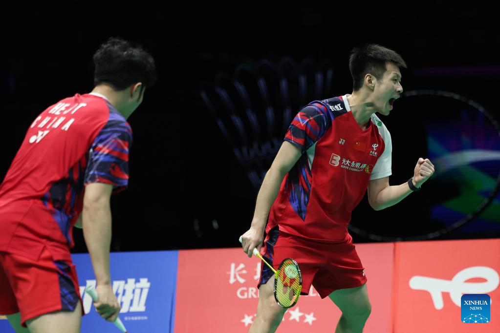 He Jiting/Ren Xiangyu (R) of China celebrate in the doubles match against Dhruv Kapila/Sai Pratheek. K of India of the quarterfinal between China and India at BWF Thomas Cup Finals in Chengdu, southwest China's Sichuan Province, May 2, 2024. (Xinhua/Chen Bin)