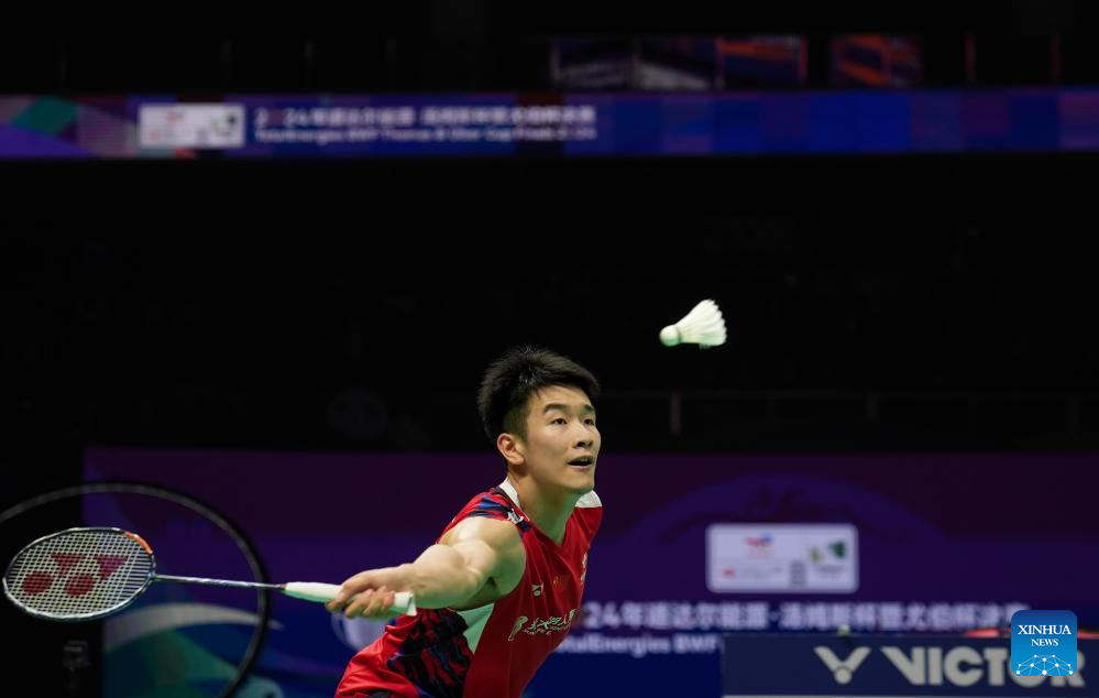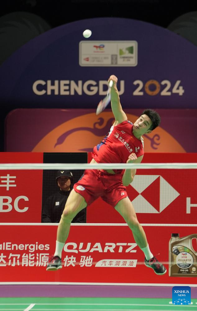 Li Shifeng of China competes against Lakshya Sen of India in the singles match of the quarterfinal between China and India at BWF Thomas Cup Finals in Chengdu, southwest China's Sichuan Province, May 2, 2024. (Xinhua/Jiang Hongjing)