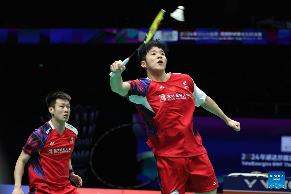 He Jiting (R)/Ren Xiangyu of China compete against Dhruv Kapila/Sai Pratheek. K of India in the doubles match of the quarterfinal between China and India at BWF Thomas Cup Finals in Chengdu, southwest China's Sichuan Province, May 2, 2024. (Xinhua/Chen Bin)