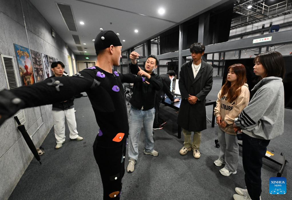 Cui Shengji (C) briefs the movements of a motion capture actor to his colleagues at a motion capture booth c the National Animation Industry Park, Binhai New Area, north China's Tianjin Municipality, April 23, 2024. (Xinhua/Zhao Zishuo)