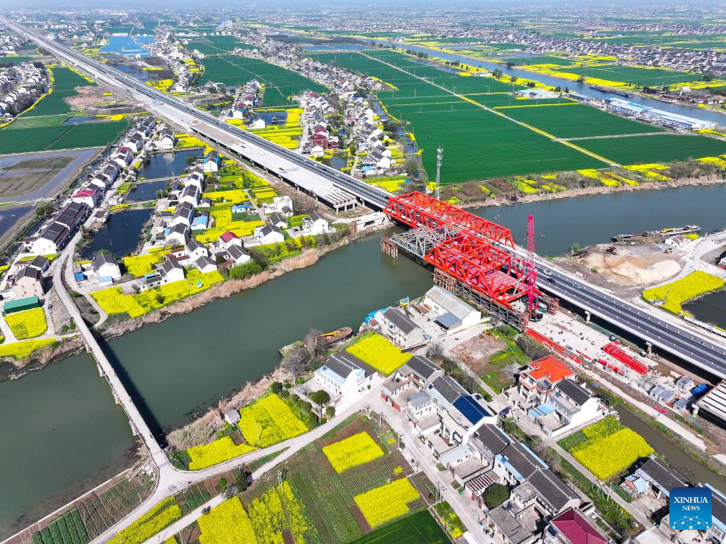 An aerial drone photo taken on March 29, 2024 shows a construction site on the expressway linking east China's Shanghai and northwest China's Shaanxi Province. (Xinhua/Ji Chunpeng)