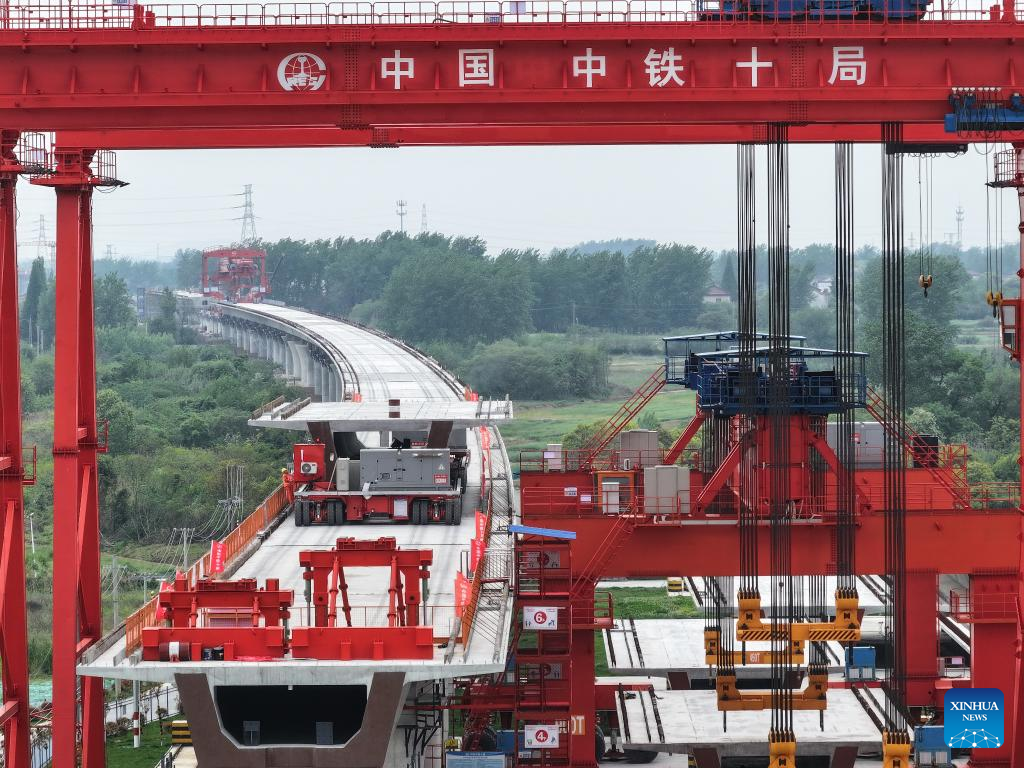 An aerial drone photo taken on April 25, 2024 shows a construction site on the high-speed railway linking east China's Shanghai, southwest China's Chongqing and Chengdu of southwest China's Sichuan Province. (Xinhua/Ji Chunpeng)