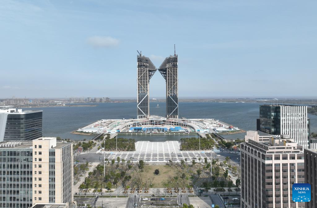 An aerial drone photo taken on March 27, 2024 shows a construction site at Lingang new area of the China (Shanghai) Pilot Free Trade Zone in east China's Shanghai. (Photo by Zhang Jiaxing/Xinhua)